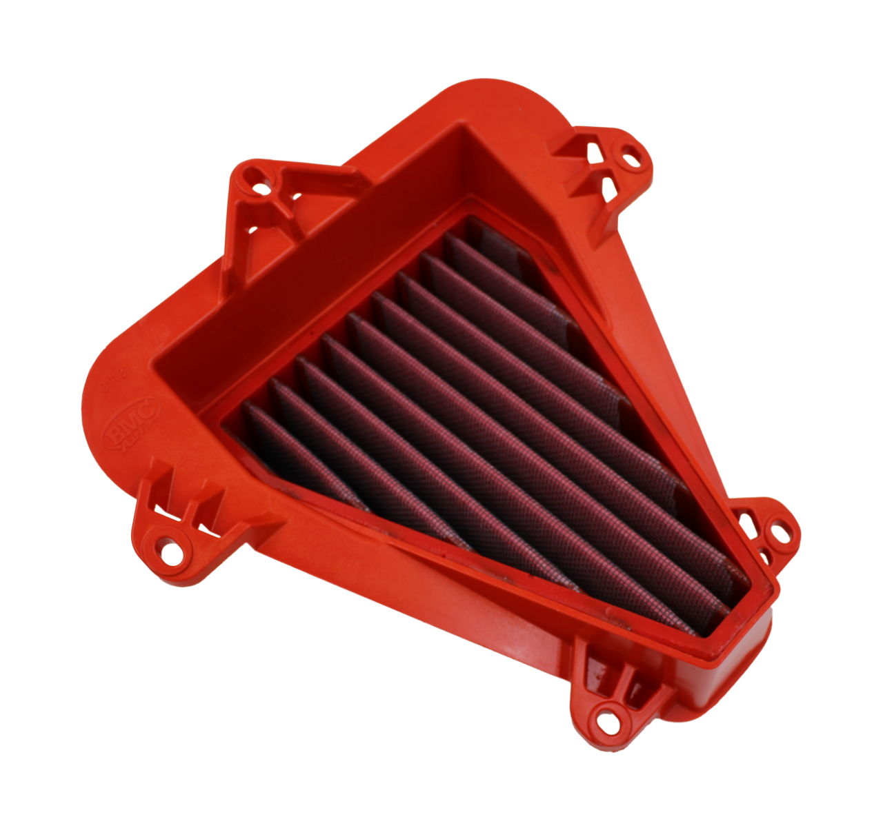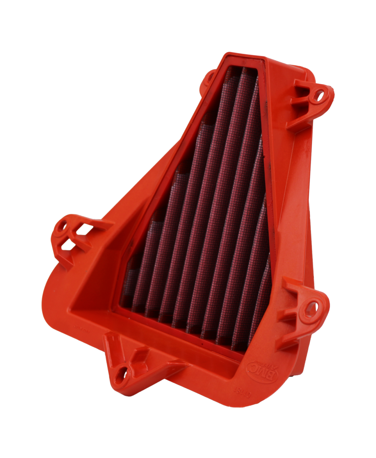 BMC's Filterrahmenkonstruktion wird in einem einzigartigem Prozess, "Full Moulding" genannt, gefertigt. Dieser ermöglicht die Produktion des auffällig roten Filters in einem einzigen Formungsprozess, ohne, dass die Ecken geklebt werden müssen, was Brüche verursachen würde. Am BMC Luftfilter ragt von allen auf dem Markt verfügbaren Filtern am wenigsten Gummimaterial über (weniger als 6 mm) und ermöglicht so eine maximale Filteroberfläche.