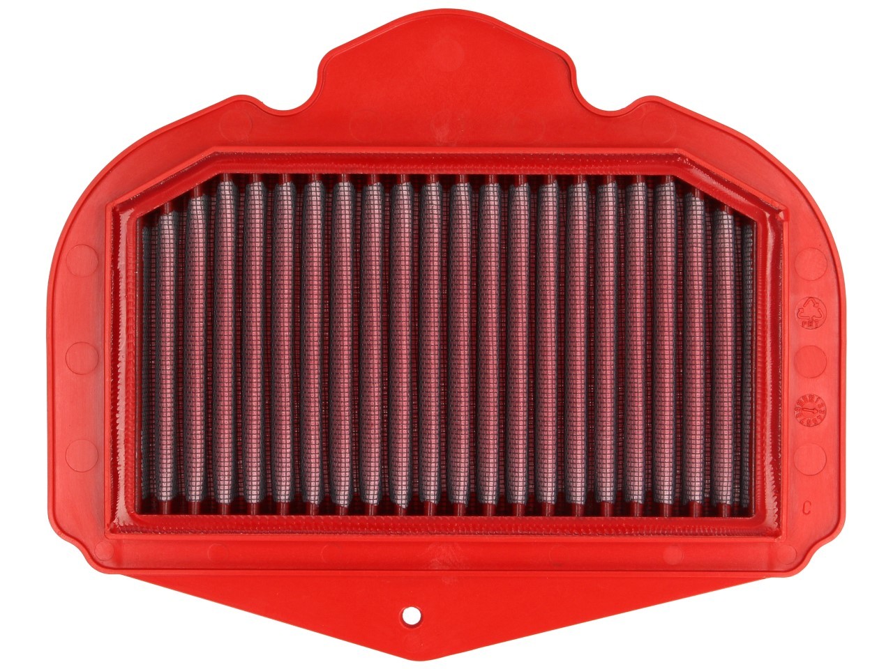 BMC's Filterrahmenkonstruktion wird in einem einzigartigem Prozess, "Full Moulding" genannt, gefertigt. Dieser ermöglicht die Produktion des auffällig roten Filters in einem einzigen Formungsprozess, ohne, dass die Ecken geklebt werden müssen, was Brüche verursachen würde. Am BMC Luftfilter ragt von allen auf dem Markt verfügbaren Filtern am wenigsten Gummimaterial über (weniger als 6 mm) und ermöglicht so eine maximale Filteroberfläche.
