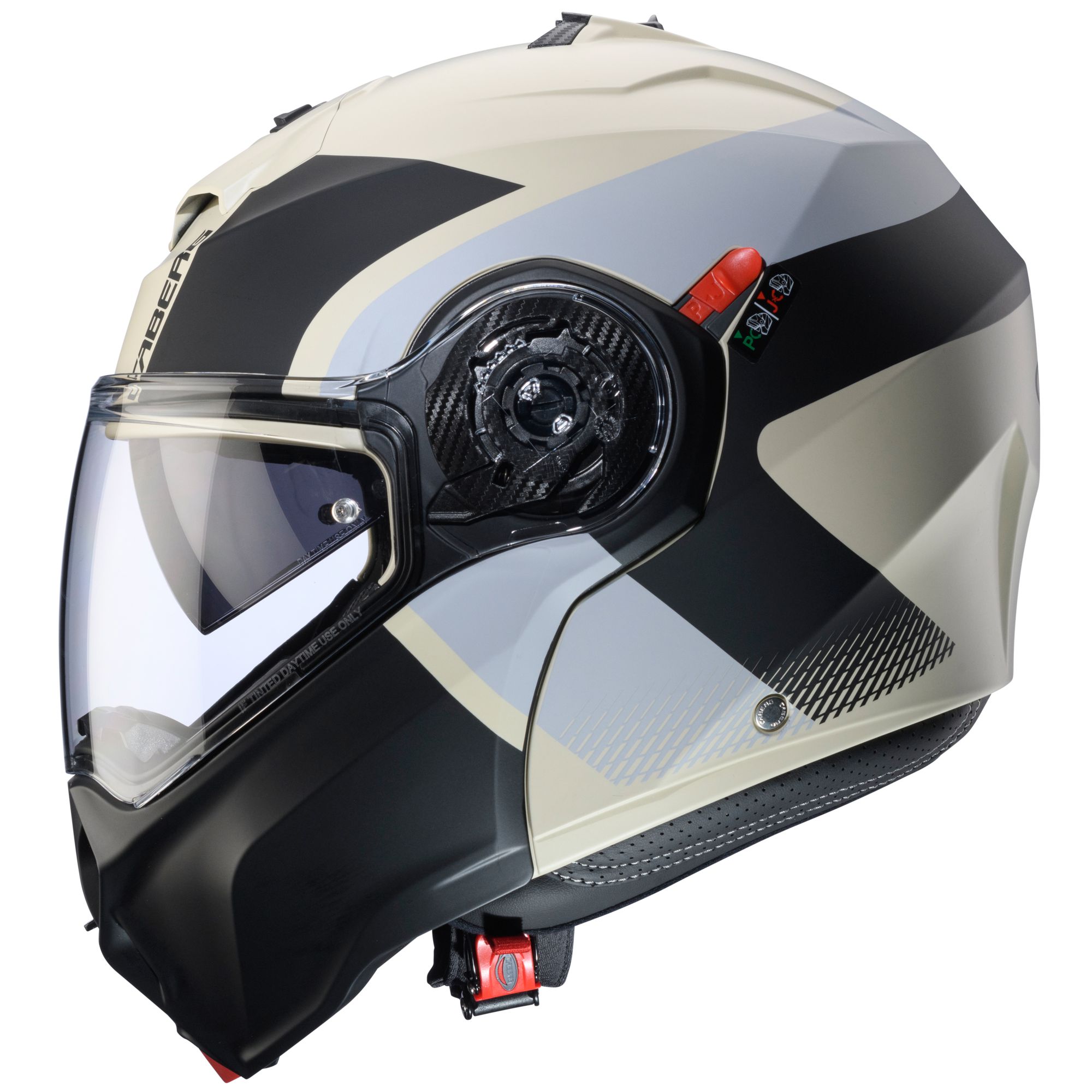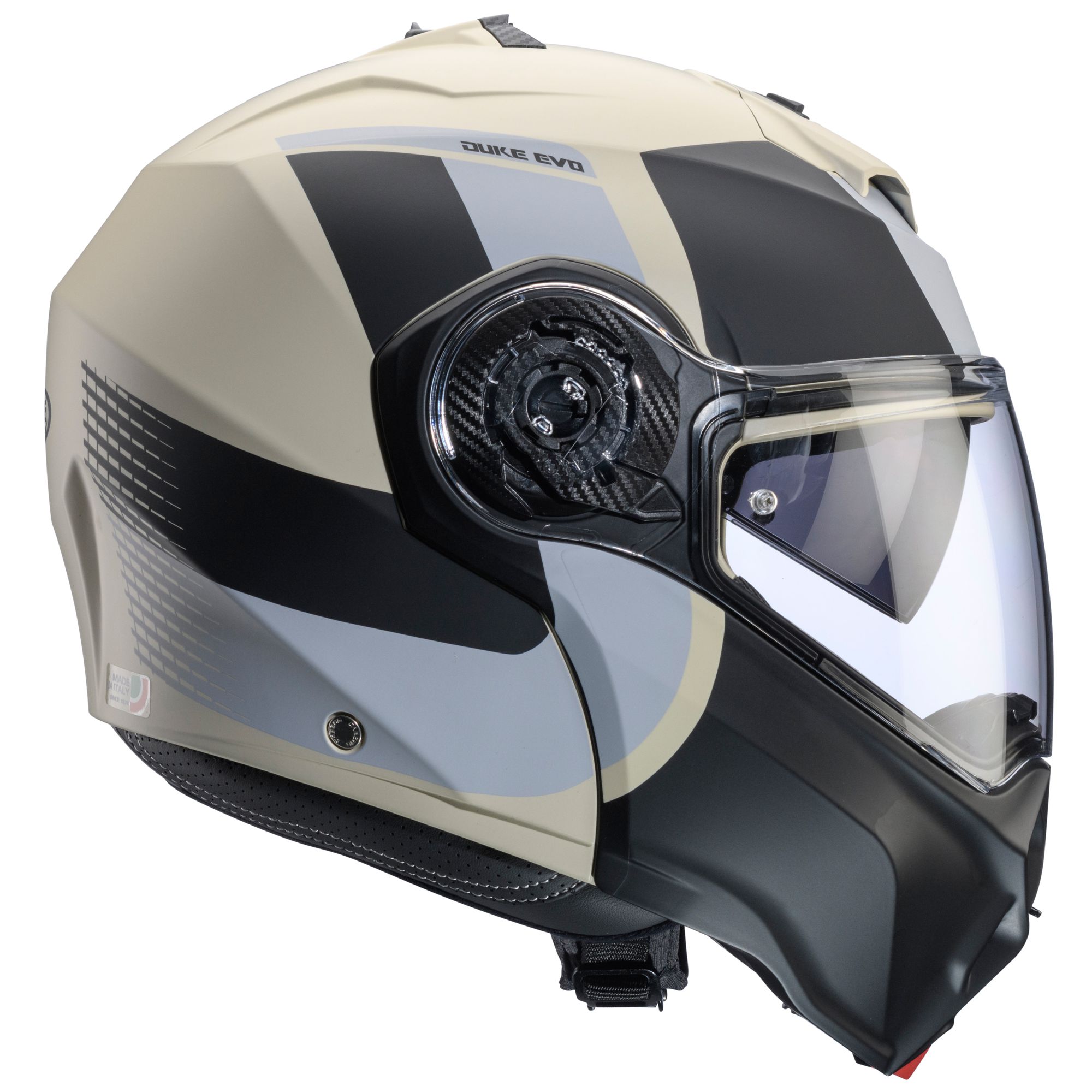 Der Caberg Duke Evo Klapphelm mit dem Dekor Indy in den Farben matt-sand/schwarz-grau verfügt über die folgenden Eigenschaften: