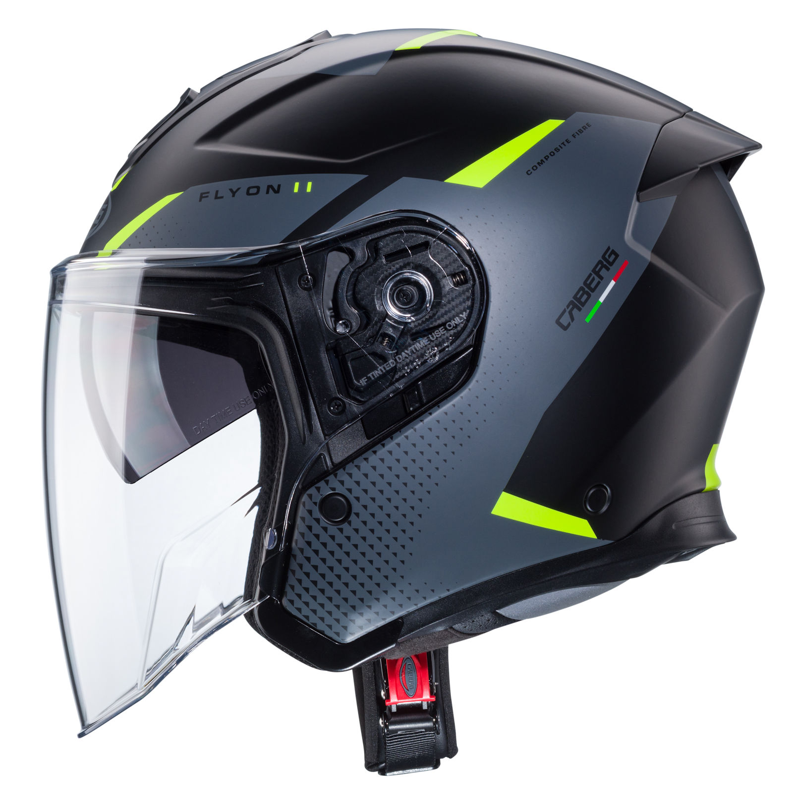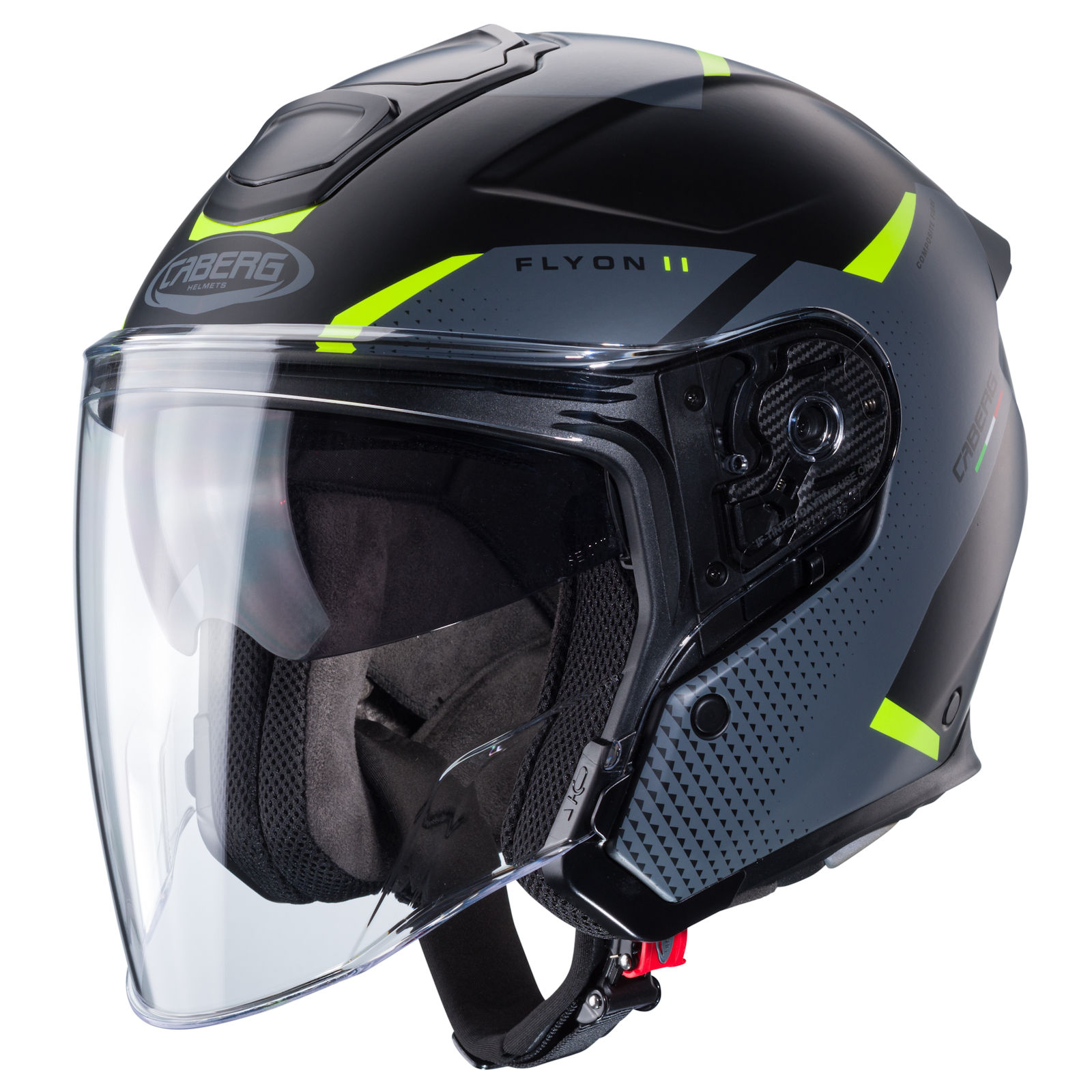 Der Caberg Flyon II Jethelm mit dem Dekor Boss in den Farben matt-schwarz/grau-fluo-gelb verfügt über die folgenden Eigenschaften: