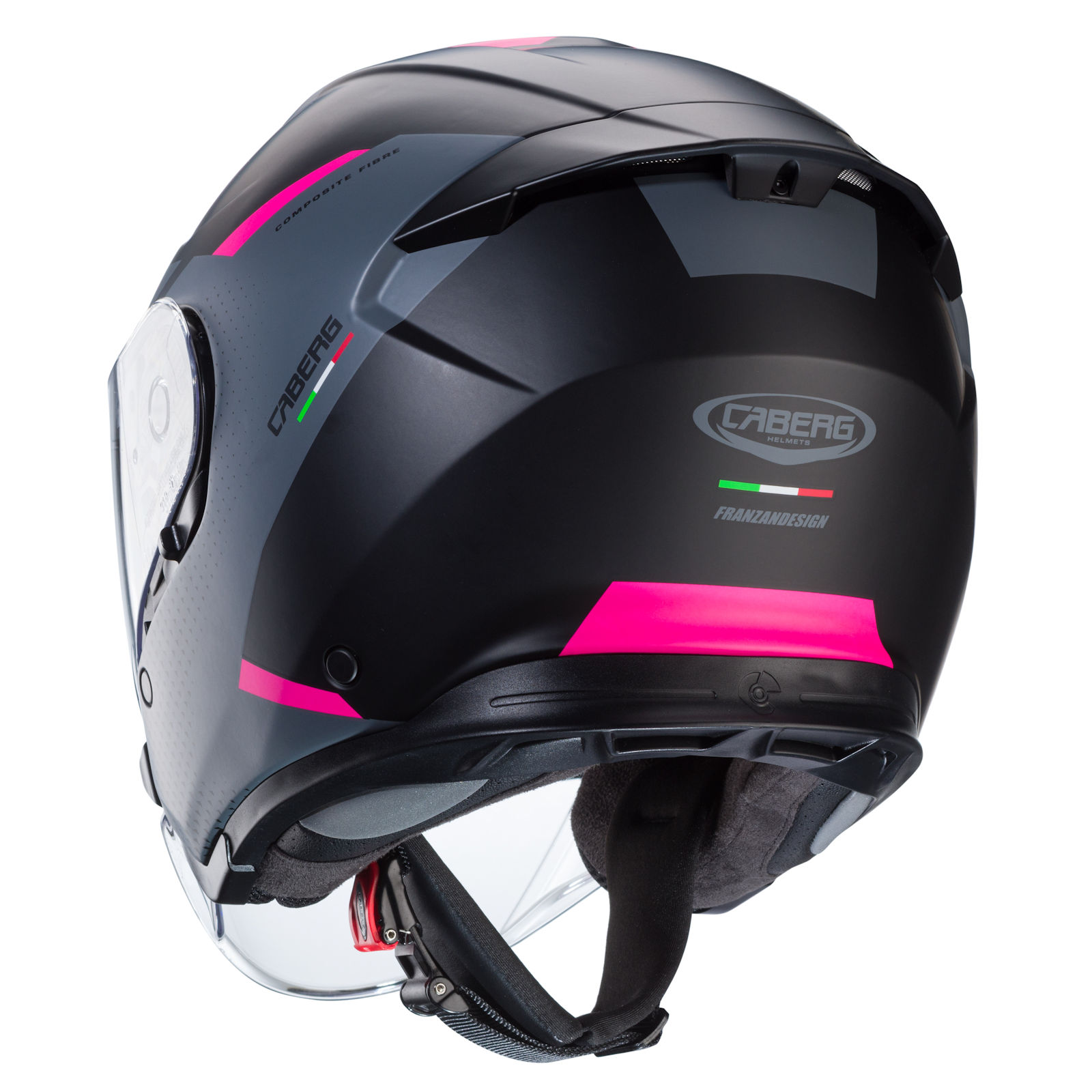 Der Caberg Flyon II Jethelm mit dem Dekor Boss in den Farben matt-schwarz/grau-Fuchsia verfügt über die folgenden Eigenschaften: