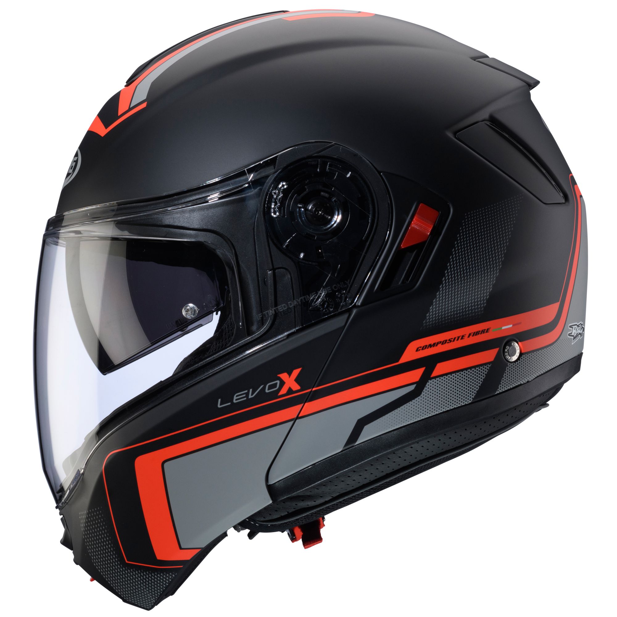 Der Caberg Levo X Klapphelm mit dem Dekor Elite in den Farben matt-schwarz/anthrazit-rot verfügt über die folgenden Eigenschaften: