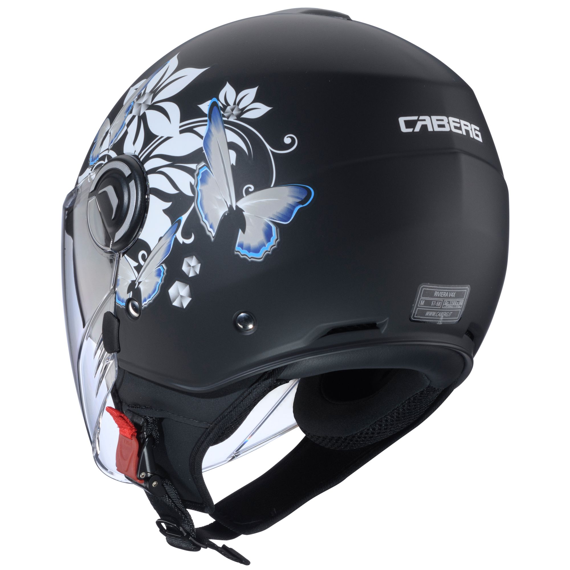 Der Caberg Riviera V4 X Jethelm mit dem Dekor Mia in den Farben matt-schwarz/weiß-grau-hellblau verfügt über die folgenden Eigenschaften: