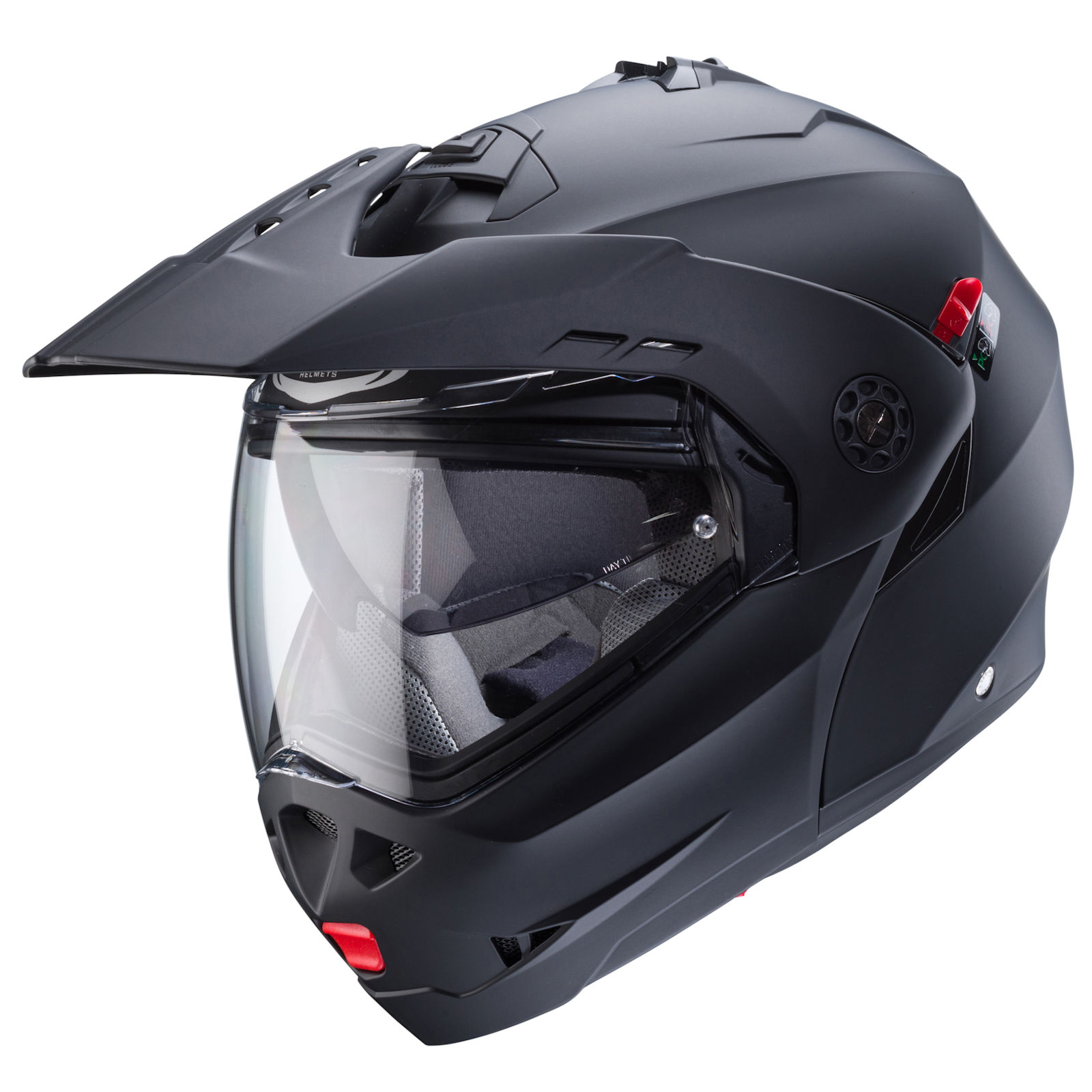 Der Caberg Helm Tourmax X ist ein hochklappbarer Adventure-Helm, speziell für Motorradfahrer im Endurobereich entwickelt. Dieser komfortable und nach der aktuellen ECE 22.06-Norm geprüfte Klapphelm bietet die Möglichkeit, mit offenem oder geschlossenem Frontteil zu fahren. Ein praktischer Hebel in der Position „J“ blockiert den Kinnschutz in vollständig geöffneter Stellung und verhindert ein unbeabsichtigtes Schließen – ideal für maximale Sicherheit und Flexibilität. Dieser Klapphelm überzeugt sowohl bei anspruchsvollen Offroad-Touren als auch auf entspannten Landstraßenfahrten Richtung Urlaub. Mit nur einem Handgriff lässt sich das Kinnteil hochklappen und sicher fixieren. Beide Tragevarianten – offen und geschlossen – wurden umfassend getestet (Dual Homologation), um höchsten Sicherheitsstandards zu entsprechen. Komfortabel und funktional ausgestattet, sorgt der Helm mit seinem herausnehmbaren, atmungsaktiven und waschbaren Innenfutter sowie der individuell einstellbaren Belüftung im Kinn- und Stirnbereich für ein angenehmes Fahrerlebnis, auch auf langen Touren. Das Pinlock®-Doppelvisier gewährleistet zusammen mit der integrierten Sonnenblende jederzeit klare Sicht. Für zusätzliche Unterhaltung, Navigation und Kommunikation lässt sich der Helm optional mit einem Bluetooth-System ausstatten.