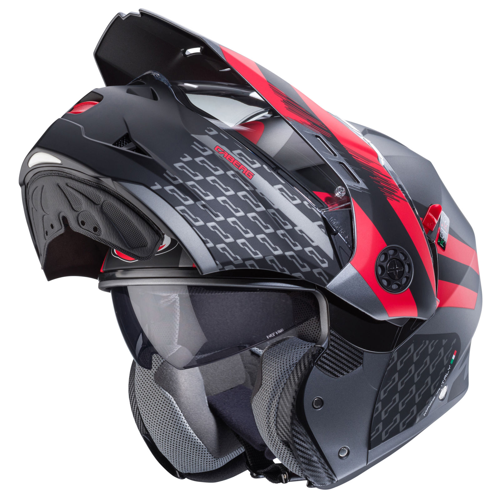 Der Caberg Tourmax X Klapphelm mit dem Dekor Sarabe in den Farben matt-gun metallic/schwarz-rot verfügt über die folgenden Eigenschaften: