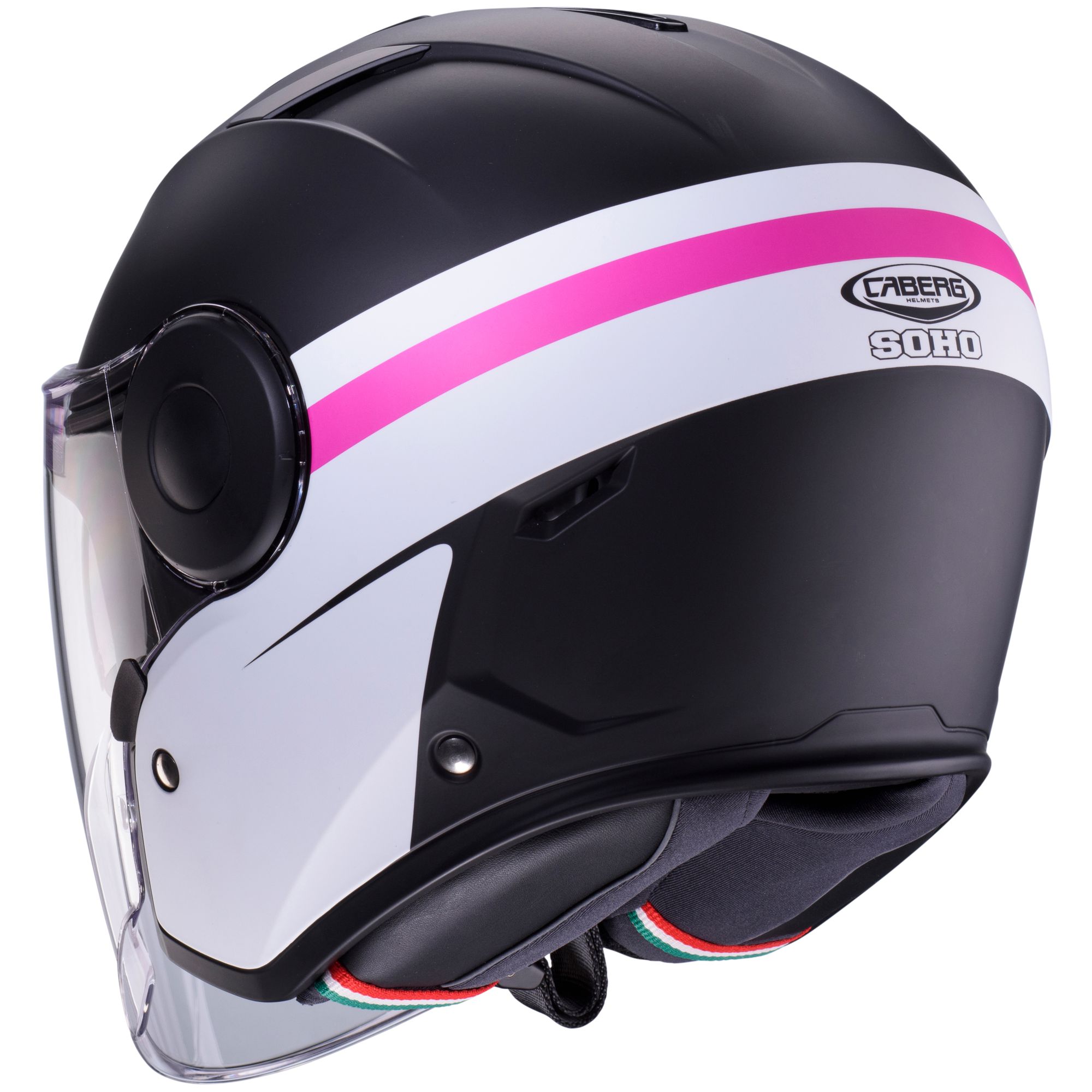 Der Caberg Soho Jethelm mit dem Dekor Zephyr in den Farben matt-schwarz/weiß-Fuchsia verfügt über die folgenden Eigenschaften: