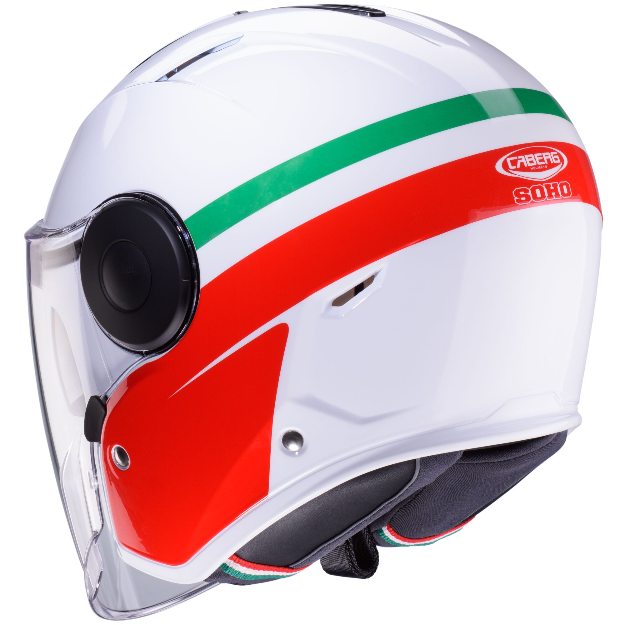 Der Caberg Soho Jethelm mit dem Dekor Zephyr in den Farben Italia weiß/grün-rot verfügt über die folgenden Eigenschaften: