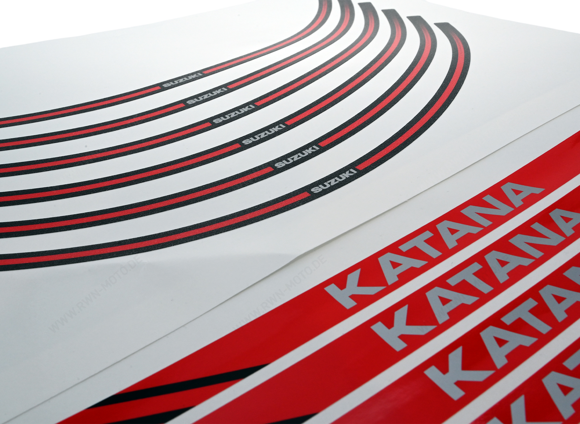 Felgenbettdekor für eine Felge mit Katana Logo inkl. Felgendekor mit Suzuki Logo. Set besteht aus 12 Dekorelementen.