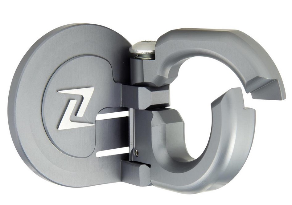 Gepäckhaken aus hochfestem Aluminium, CNC gefräst, grau matt, eloxiert, mit ZELIONI Logo. Klappbar, mit Arretierung.