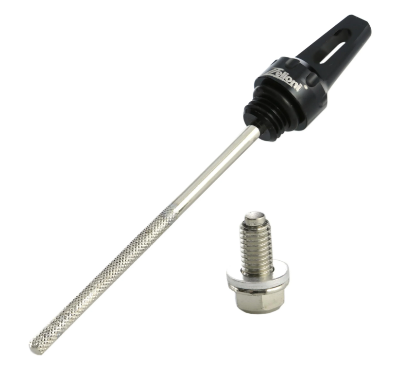 Schrauben Kit ZELIONI, bestehend aus 1x ohne Magnet (Ölstandstab) + 1x mit Magnet (Ölablassschraube). Die magnetische Ölablassschraube filtert zuverlässig Metallabrieb aus dem Getriebeöl.