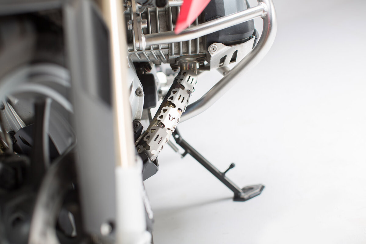 Der Motorrad-Krümmerschutz ist als Ergänzung zum Motorschutz gedacht und schützt die vorderen Krümmer-Rohre vor Steinschlag. Gleichzeitig dient die robuste Edelstahl-Blende als Hitzeschutz. Der universell einsetzbare Protektor steht in zwei Varianten für Rohrdurchmesser von 32 bis 50 mm sowie 50 bis 70 mm zur Verfügung. Durch die Aufteilung in flexible Segmente lassen sich die Abdeckungen problemlos an die Krümmer-Form anpassen. So kann sich der Anwender – abhängig von Rohranzahl und Rohrdurchmesser – für nahezu jedes Motorrad-Modell die passende Ummantelung zusammenstellen.