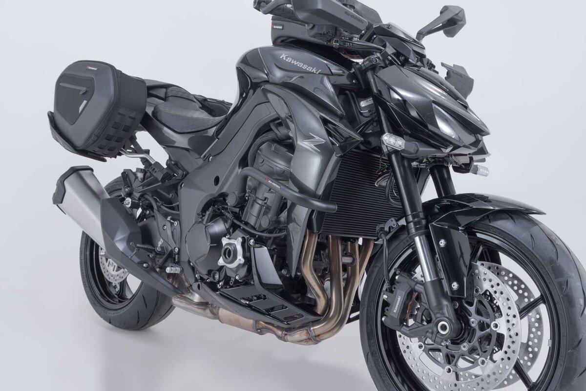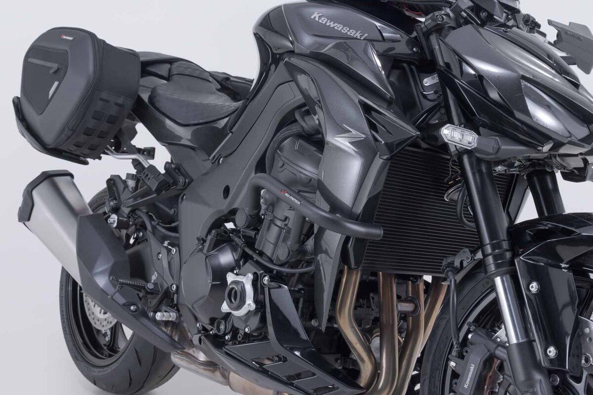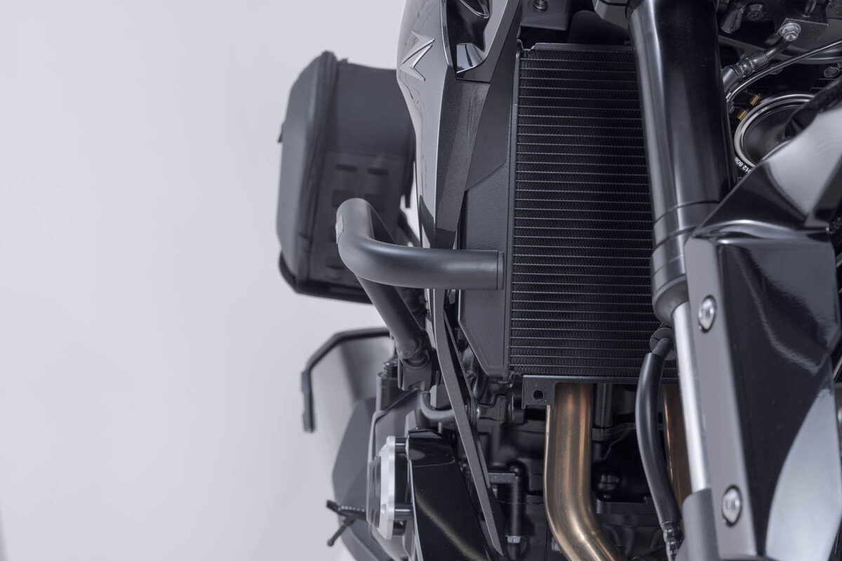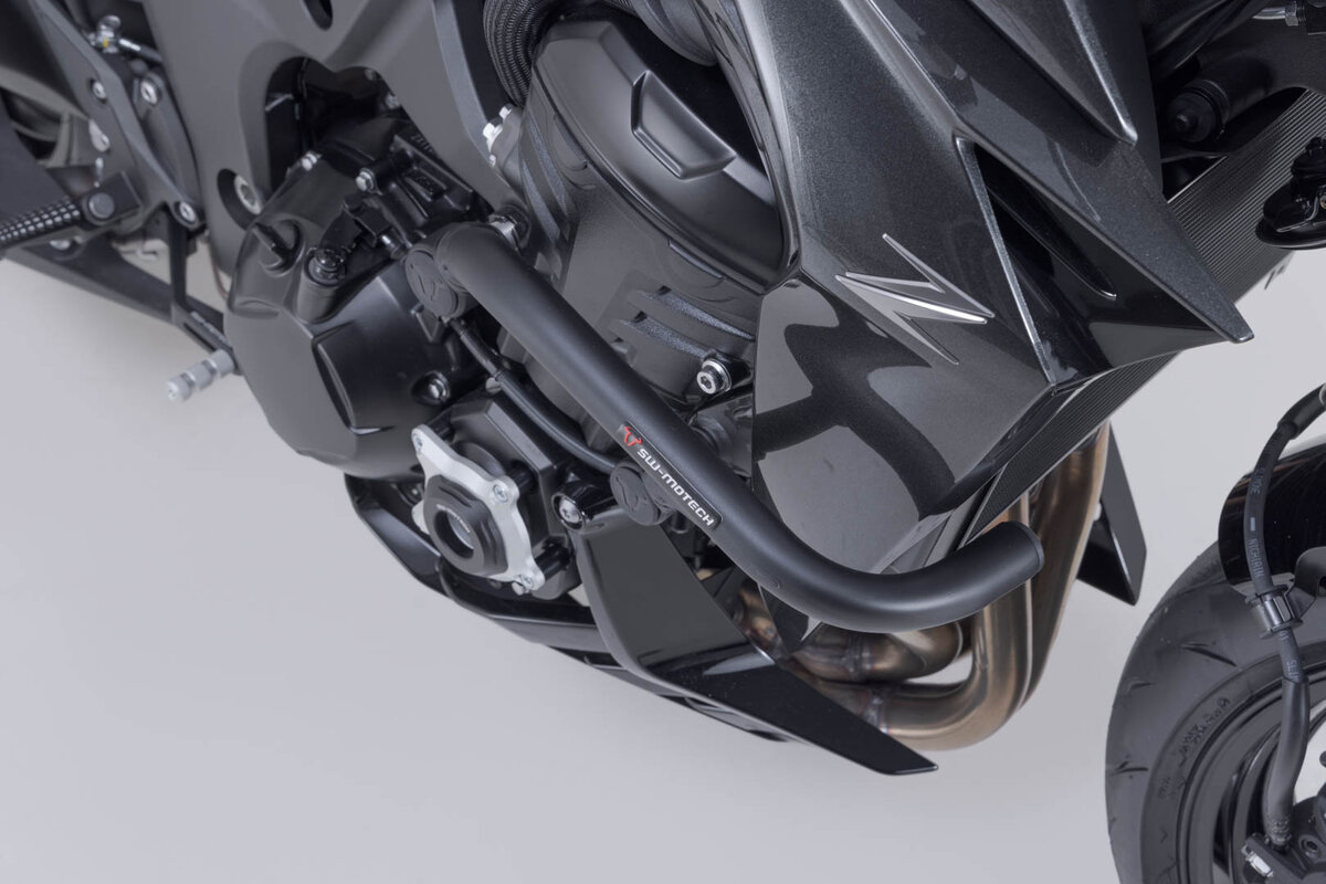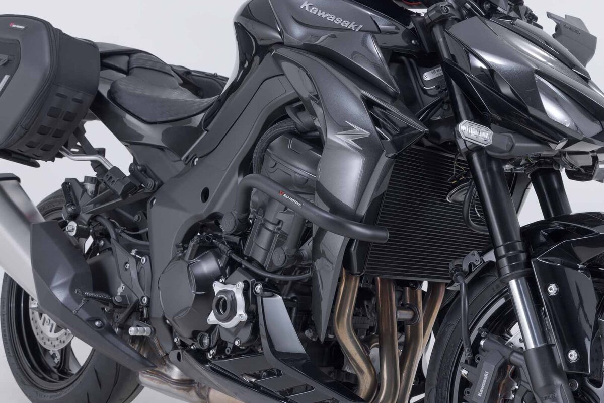 Passend zur Kawasaki Z1100 werden die Sturzbügel aus Stahlrohr mit witterungs- und korrosionsbeständiger Pulverbeschichtung in Schwarz angeboten. Die Oberflächenveredelung erfolgt in einer hochmodernen Anlage im SW-MOTECH Werk im tschechischen Brünn.