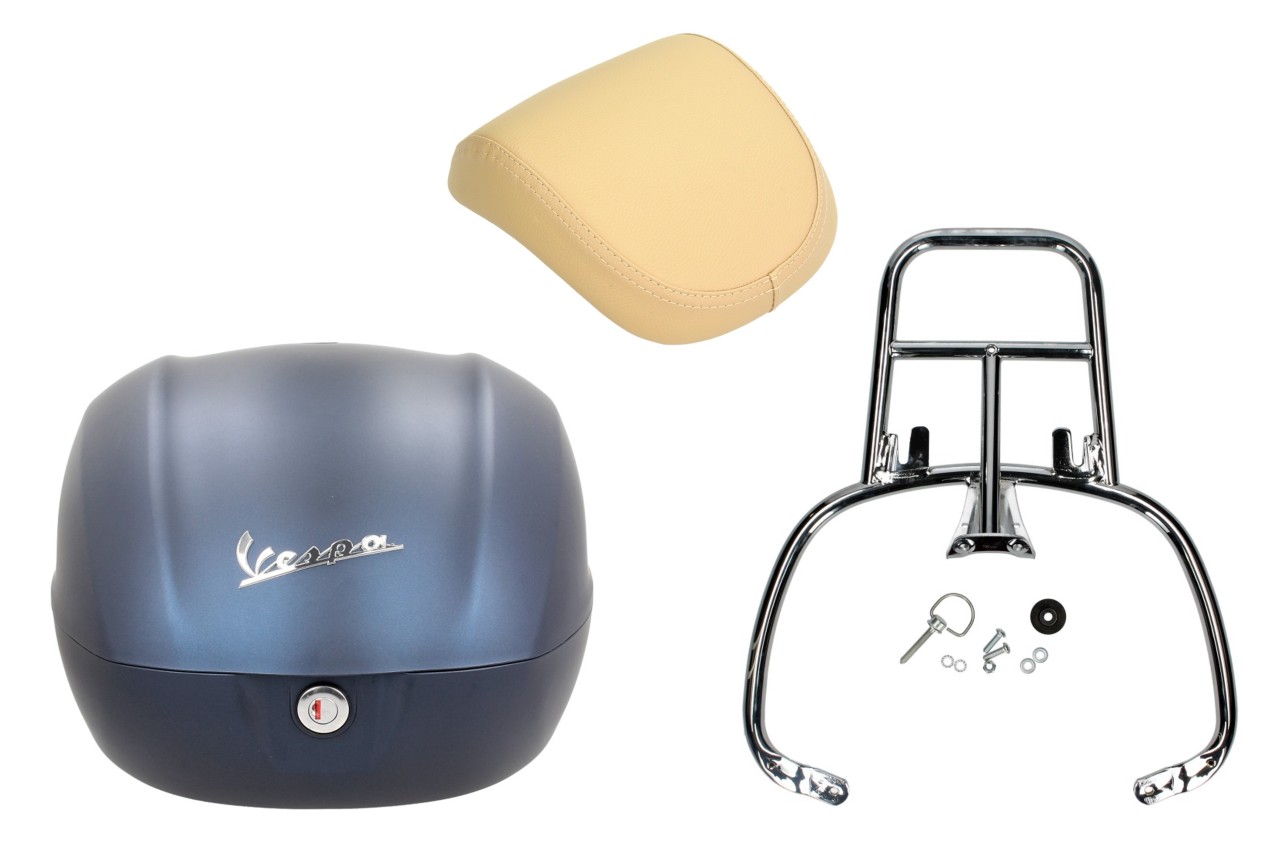 Produktinformationen "Topcase Kit 32L blau matt (282/A), Rückenpolster champagner für Vespa Primavera"